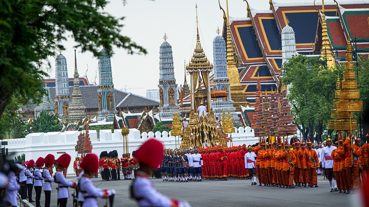 Vua Maha Vajiralonkorn cùng đoàn rước đi bộ hành lễ hơn 4 tiếng đồng hồ trên quãng đường từ hoàng cung ra quảng trường Sanam Luang - nơi đặt đài hóa thân Phra Meru - Ảnh: THUẬN THẮNG