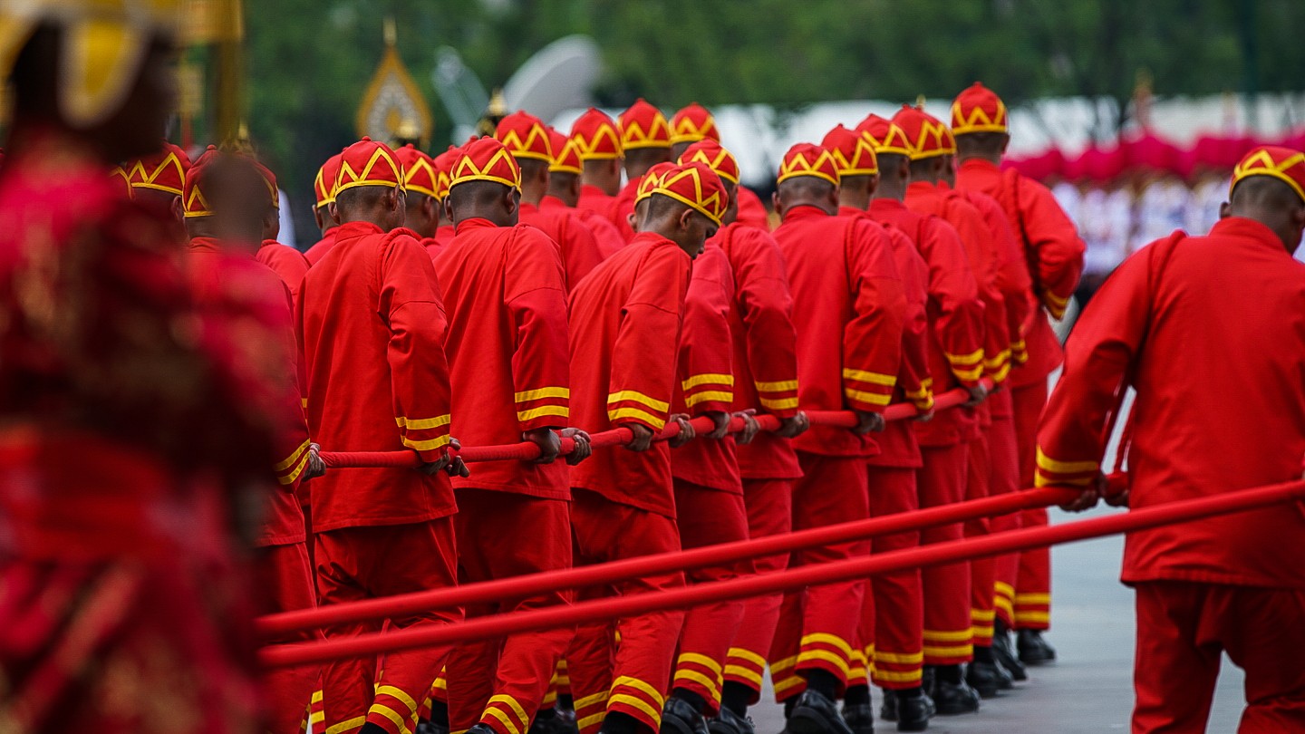 Binh sĩ hoàng gia trong trang phục truyền thống kéo xe linh cữu nhà vua Bhumibol và xe chở tăng thống Phra Maha Muniwong. Mỗi xe cần tới gần 400 người kéo - Ảnh: THUẬN THẮNG