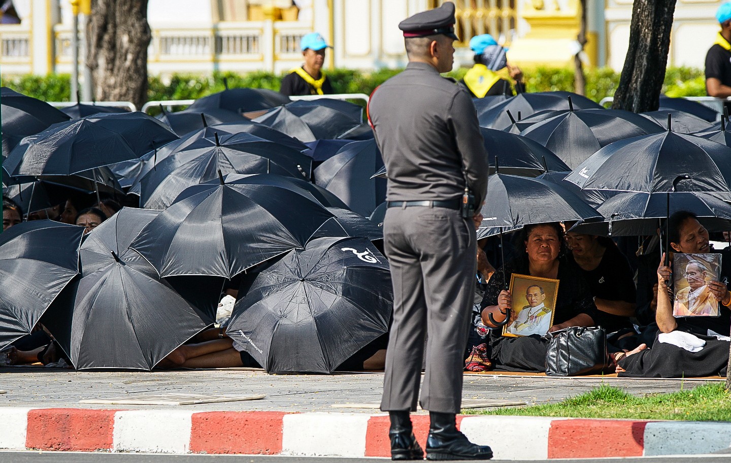 Hoàng gia Thái Lan yêu cầu mọi lực lượng chính thức như cảnh sát, quân đội, tình nguyện viên phải ăn mặc nghiêm trang nhất. Phóng viên tham gia đưa tin cũng phải tuân thủ mặc vest đen, cà vạt đen, giày da đen, tóc màu tự nhiên. Người dân cũng phải mặc đồ đen và dù mang theo cũng phải màu đen - Ảnh: THUẬN THẮNG